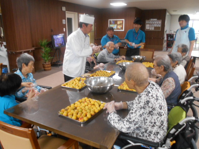 みなさんこんにちは! 6月21日(木)に春風では入居者の皆様に集まっていただき 厨房(京都花泉)さん協力のもと梅干し作りを行いました! 梅干しを作るために まずは、梅のヘタを串を使って取っていきます。 皆さん上手に丁寧に抜いて下さっていました! 中に... -